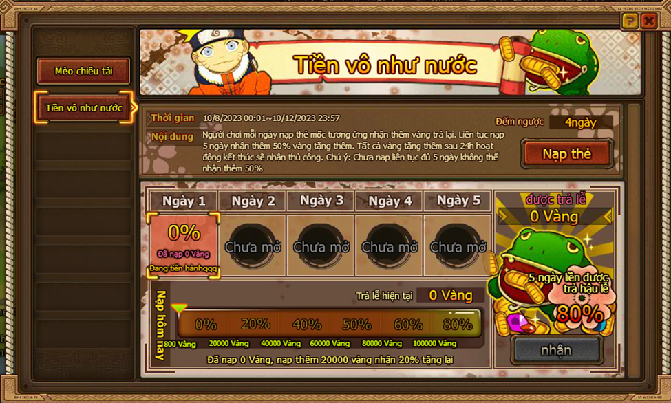 1. Người chơi mỗi ngày nạp thẻ mốc tương ứng nhận thêm vàng trả lại. Liên tục nạp 5 ngày nhận thêm 80% vàng tặng thêm. Tất cả vàng tặng thêm sau 24h hoạt động kết thúc sẽ nhận thủ công. Chú ý: Chưa nạp liên tục đủ 5 ngày không thể nhận thêm 80%.
