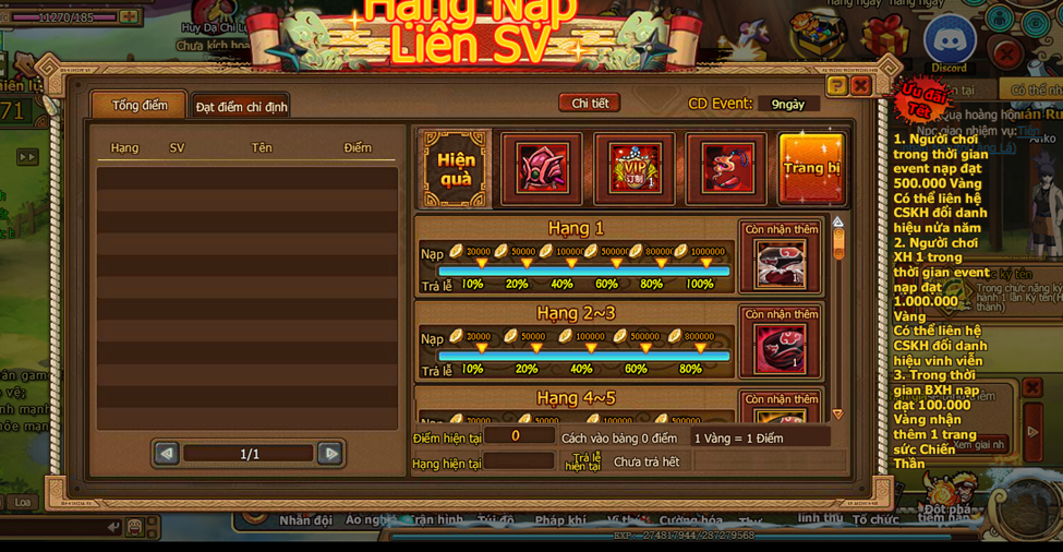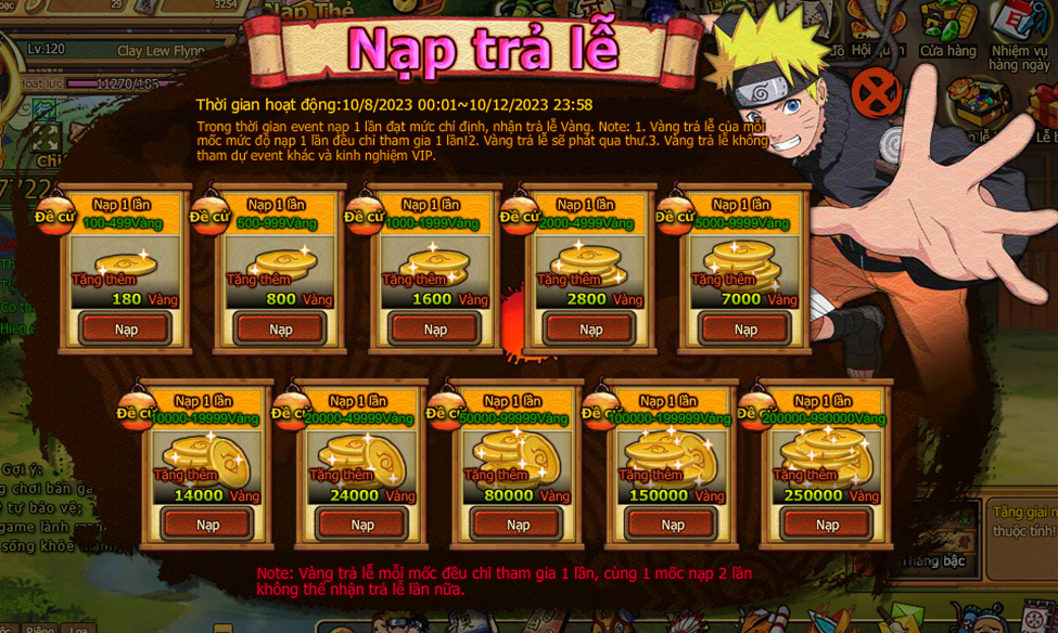 Trong thời gian event nạp 1 lần đạt mức chỉ định , nhận trả lễ vàng.