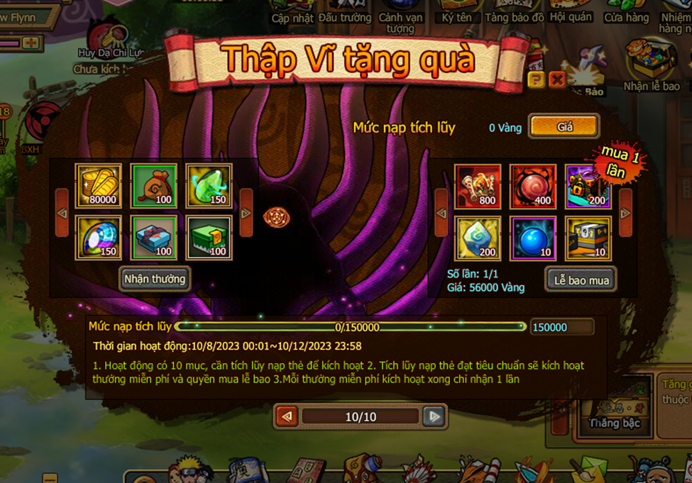 1. Hoạt động có 10 mục, cần tích lũy nạp thẻ để kích hoạt.