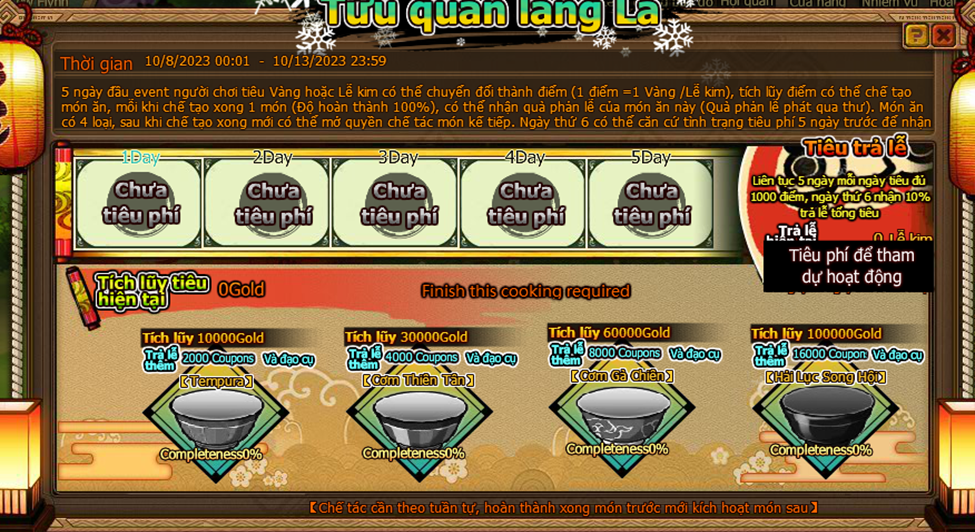 1. 5 ngày đầu event người chơi tiêu Vàng hoặc Lễ Kim có thể chuyển đổi thanh điểm ( 1 điểm = 1 vàng / lễ kim )