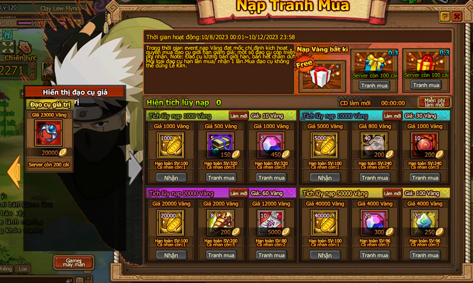 1. Trong thời gian event nạp Vàng đạt mốc chỉ định kích hoạt quyền mua đạo cụ giới hạn giảm giá: một số đạo cụ còn miễn phí nhận.