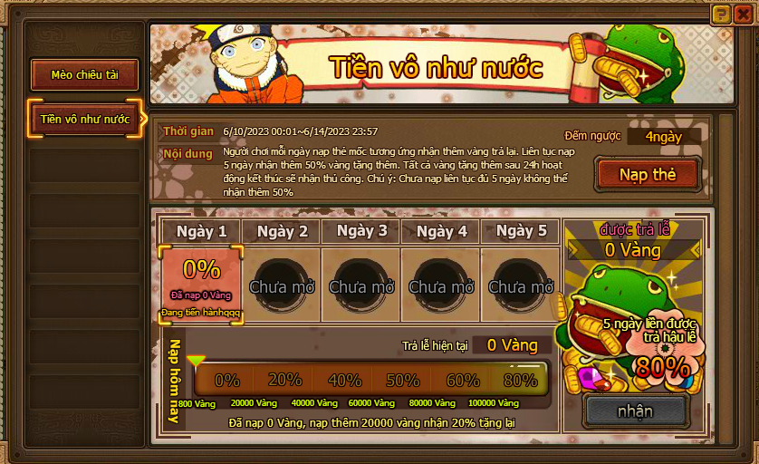 1. Người chơi mỗi ngày nạp thẻ mốc tương ứng nhận thêm vàng trả lại. Liên tục nạp 5 ngày nhận thêm 80% vàng tặng thêm. Tất cả vàng tặng thêm sau 24h hoạt động kết thúc sẽ nhận thủ công. Chú ý: Chưa nạp liên tục đủ 5 ngày không thể nhận thêm 80%.