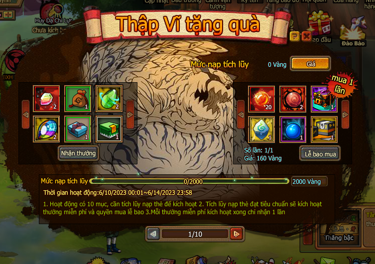 1. Hoạt động có 10 mục, cần tích lũy nạp thẻ để kích hoạt.