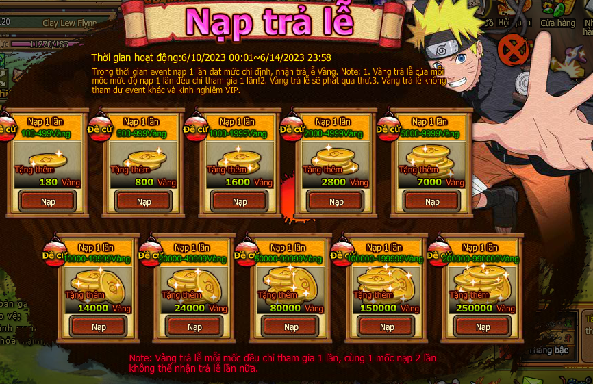 Trong thời gian event nạp 1 lần đạt mức chỉ định , nhận trả lễ vàng