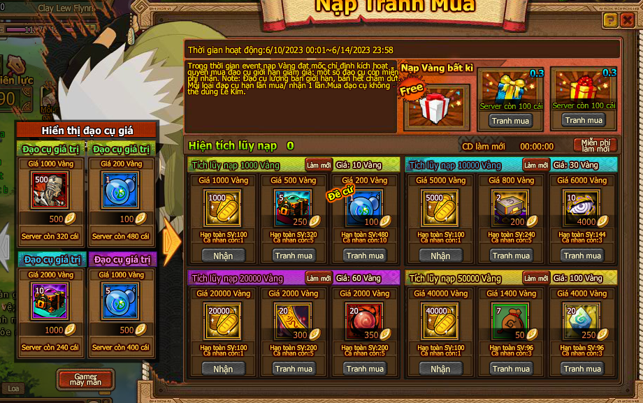 1. Trong thời gian event nạp Vàng đạt mốc chỉ định kích hoạt quyền mua đạo cụ giới hạn giảm giá: một số đạo cụ còn miễn phí nhận.