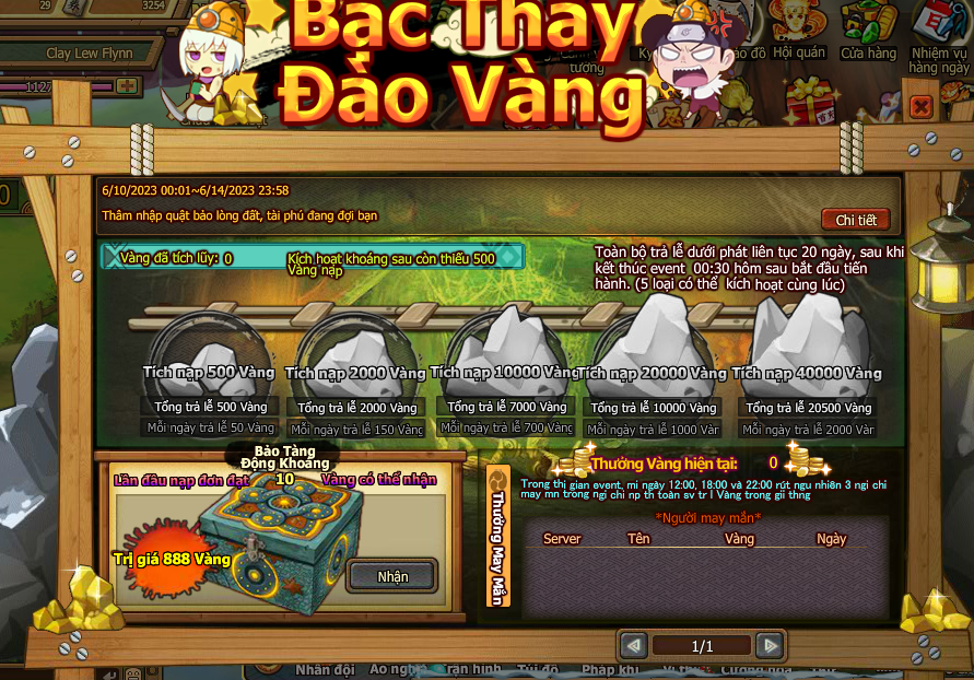 5. Trong thời gian event , nạp 1 lần đầu tiên thỏa nhận thêm bảo tàng khoáng . Trong thời gian , thống kê mức nạp của người chơi toan sv đến giải thưởng may mắn , Mổi nạp 1 Vàng giải thưởng tăng 1 Vàng , mỗi ngày 12:00, 18:00, 22:00 rút ngẫu nhiên 3 người chơi may mắn trong người chơi nạp thẻ toàn sv trả lễ Vàng