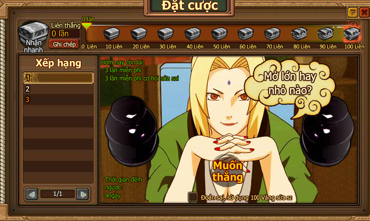 2. Thi đấu bắt đầu khi người chơi điểm số mình lớn hơn hay nhở hơn điểm của Tsunade, nhấn vào nút Lớn hoặc Nhỏ.
