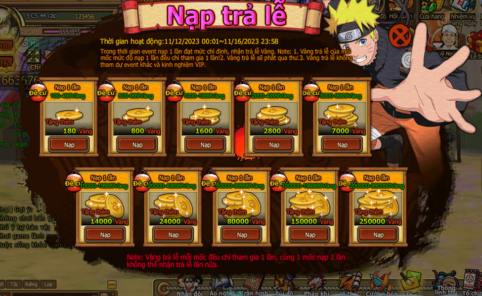 Trong thời gian event nạp 1 lần đạt mức chỉ định , nhận trả lễ vàng .