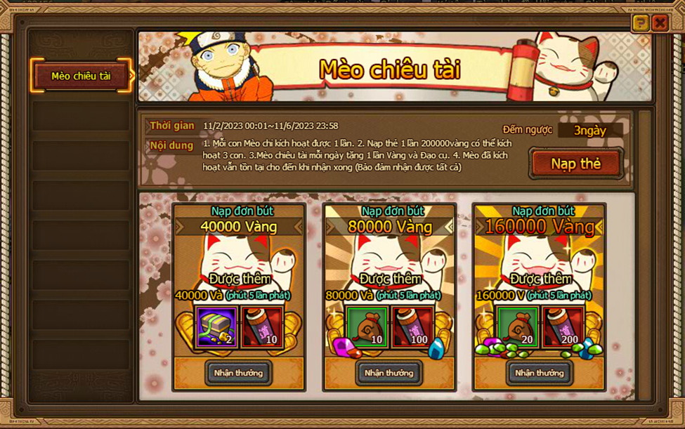 Lưu Ý: nạp 1 lần 200.000 vàng mới nhận cả 3 con mèo