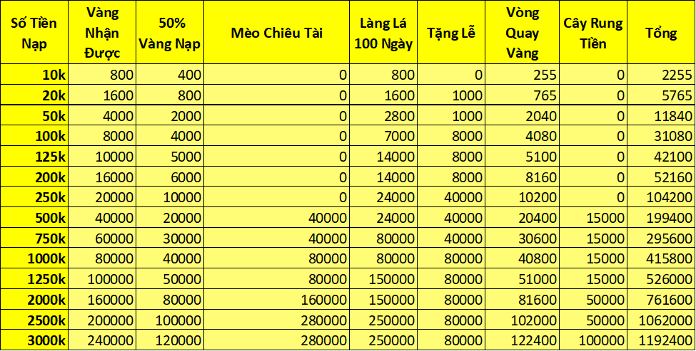 1. Trong thời gian event , người chơi nạp đủ 500 vàng nhận 1 lần cơ hội quay (vòng quay vàng)