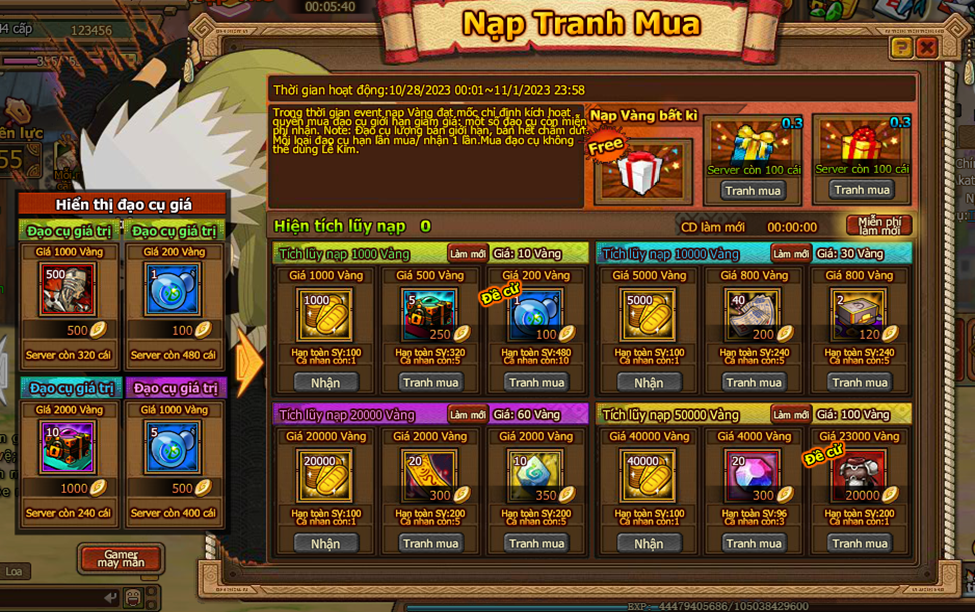 1. Trong thời gian event nạp Vàng đạt mốc chỉ định kích hoạt quyền mua đạo cụ giới hạn giảm giá: một số đạo cụ còn miễn phí nhận.