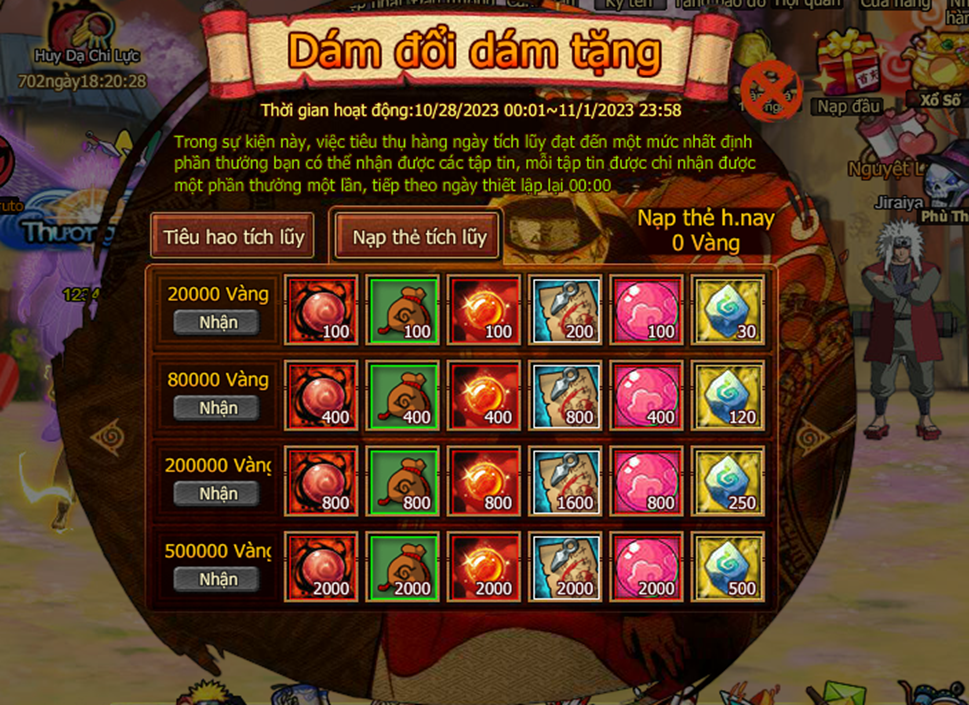 Trong thời gian event nạp 1 lần đạt mức chỉ định, nhận trả lễ vàng