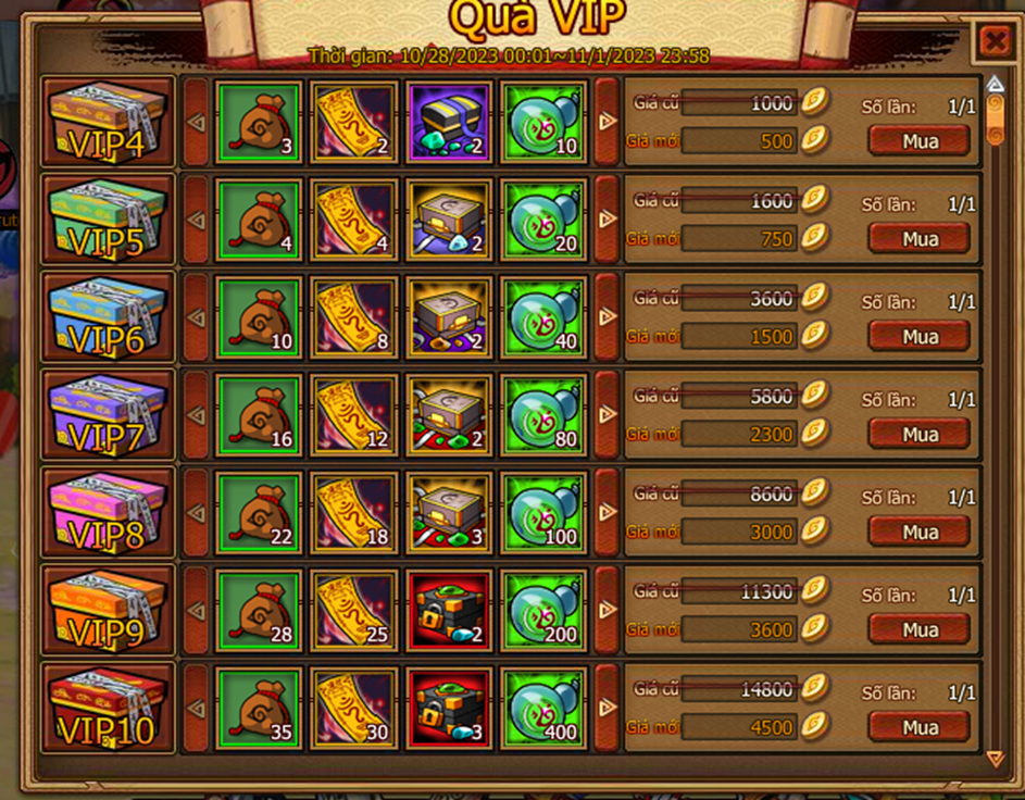Cấp vip tương ứng sẽ được mua , mua bằng vàng hoặc lễ kim