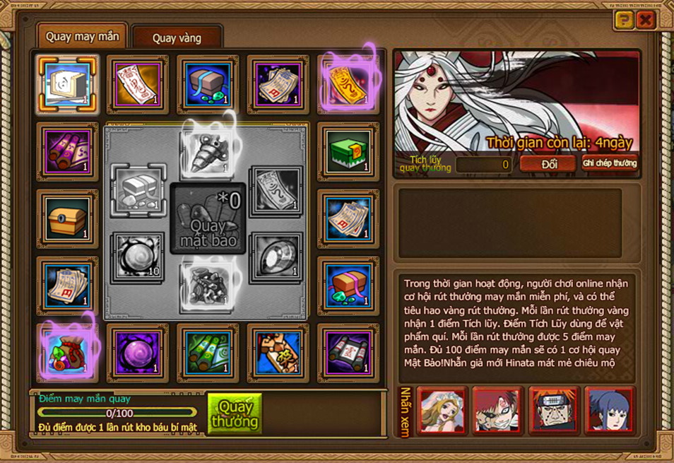 4.Lần miễn phí người chơi có thể dùng hết , có thể dùng quay ( 1 lần quay = 100 vàng )