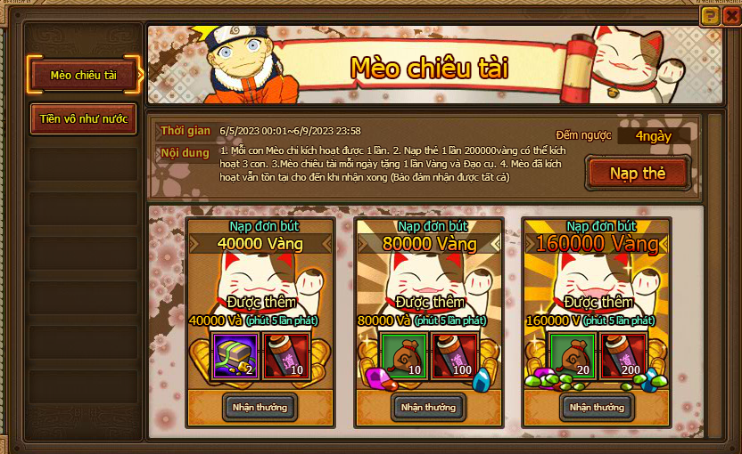 3. Mèo chiêu tài mỗi ngày tặng 1 lần Vàng và đạo cụ.
