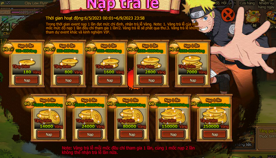 Trong thời gian event nạp 1 lần đạt mức chỉ định , nhận trả lễ vàng .