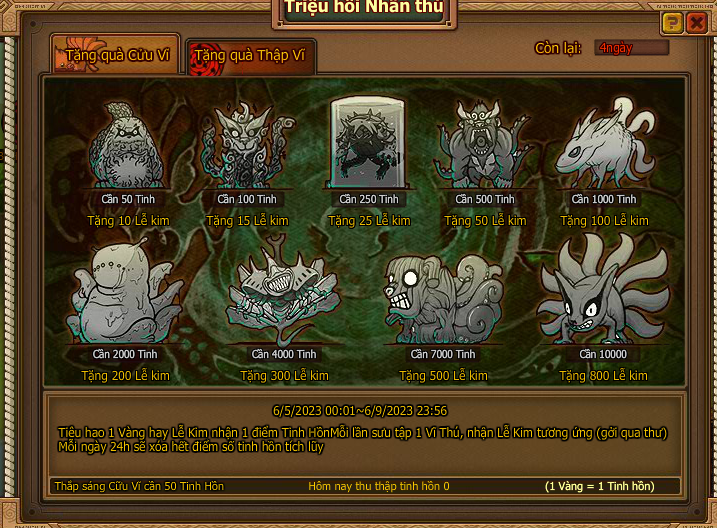 4. Tiêu hao 1 vàng/ lễ kim nhận tinh hồn , thu thập đủ điều kiện nhận rương quà qua thư