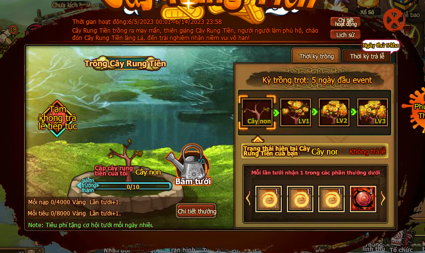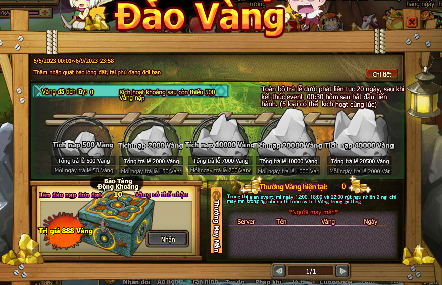 5. Trong thời gian event , nạp 1 lần đầu tiên thỏa nhận thêm bảo tàng khoáng . Trong thời gian , thống kê mức nạp của người chơi toan sv đến giải thưởng may mắn , Mổi nạp 1 Vàng giải thưởng tăng 1 Vàng , mỗi ngày 12:00, 18:00, 22:00 rút ngẫu nhiên 3 người chơi may mắn trong người chơi nạp thẻ toàn sv trả lễ Vàng