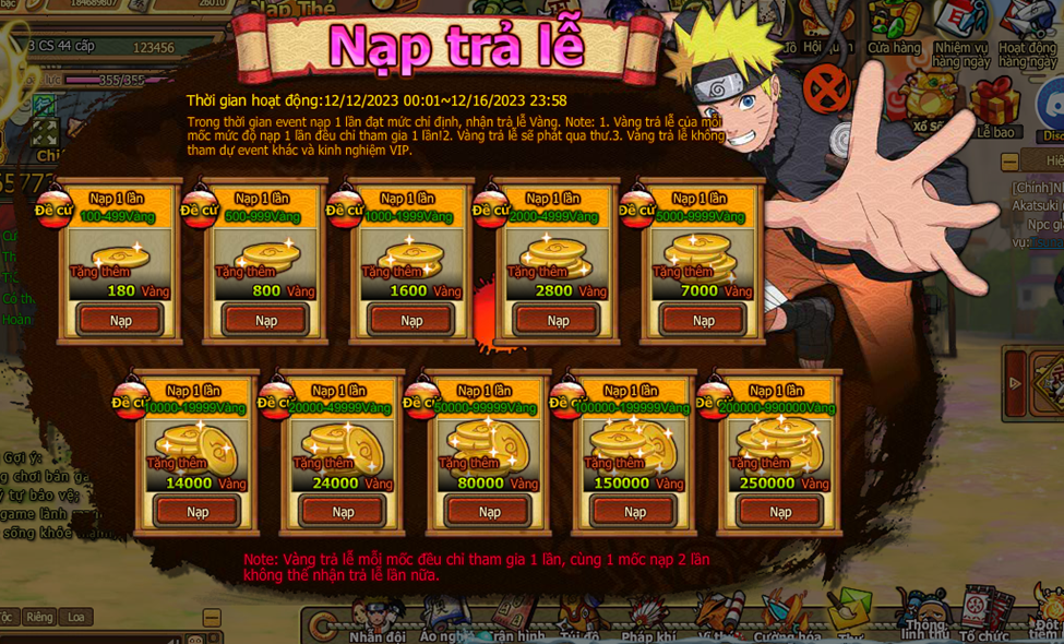 Trong thời gian event nạp 1 lần đạt mức chỉ định , nhận trả lễ vàng .