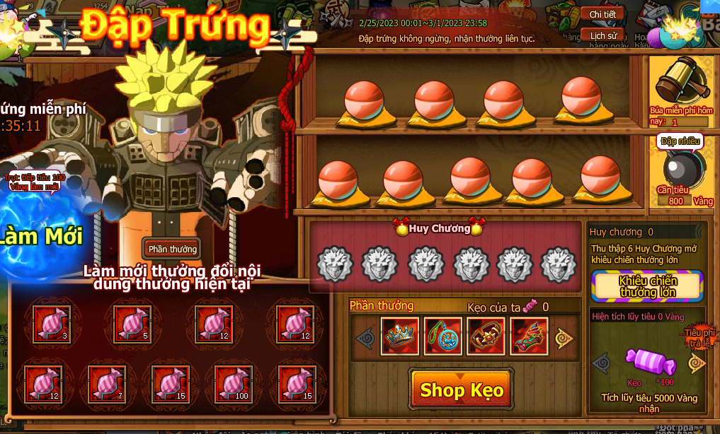 7. Trong quá trinh đập trứng nhận Huy Chương , tập hợp đủ 6 Huy Chương mở kiêu chiến thưởng lớn , ở kiêu chiến thưởng lớn nhận lượng lớn kẹo
