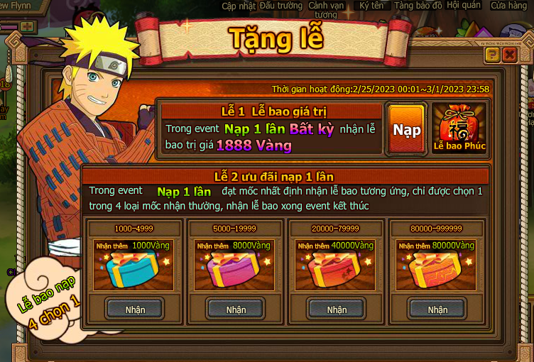 Trong sự kiện này, Nạp Đơn đạt mốc nhất định nhận lễ bao tương ứng, chỉ được chọn 1 trong 4 loại mốc nhận thưởng, nhận lễ bao xong sự kiện kết thúc.