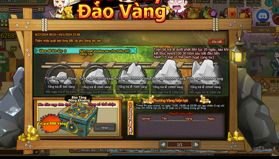 5. Trong thời gian event , nạp 1 lần đầu tiên thỏa nhận thêm bảo tàng khoáng . Trong thời gian , thống kê mức nạp của người chơi toan sv đến giải thưởng may mắn , Mổi nạp 1 Vàng giải thưởng tăng 1 Vàng , mỗi ngày 12:00, 18:00, 22:00 rút ngẫu nhiên 3 người chơi may mắn trong người chơi nạp thẻ toàn sv trả lễ Vàng