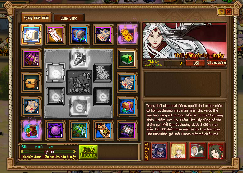 4.Lần miễn phí người chơi có thể dùng hết , có thể dùng quay ( 1 lần quay = 100 vàng )