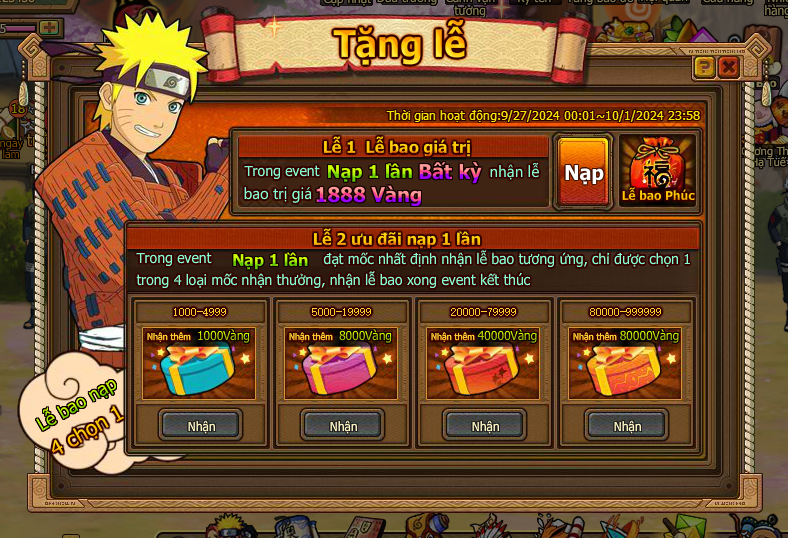 Trong thời gian event nạp 1 lần đạt mức chỉ định , nhận trả lễ vàng