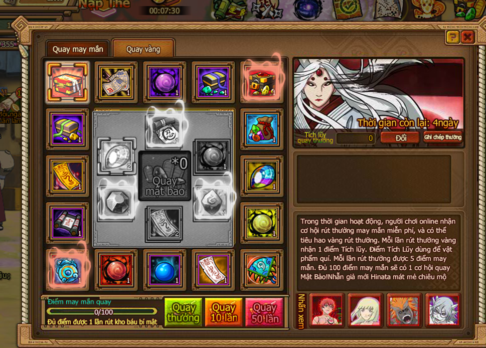 Trong thời gian hoạt động, người chơi online nhận cơ hội rút thưởng may mắn miễn phí, và có thể tiêu hao vàng và lễ kim rút thưởng. Mỗi lần rút thưởng vàng nhận 1 điểm tích lũy. Điểm Tích Lũy dùng để vật phẩm quý. Mỗi lần rút thưởng được 5 điểm may mắn. Đủ 100 điểm may mắn sẽ có 1 cơ hội quay Mật Bảo