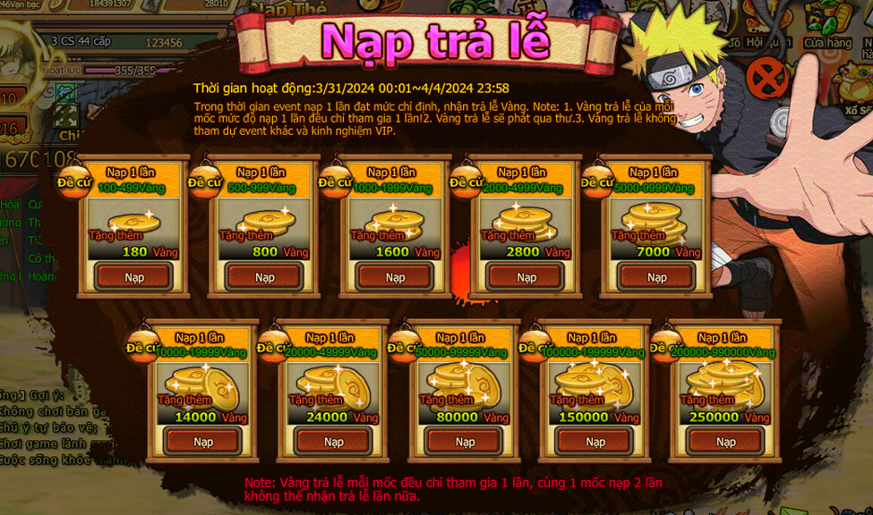 Vàng trả lễ của mỗi mốc mức độ nạp 1 lần đều chỉ tham gia 1 lần