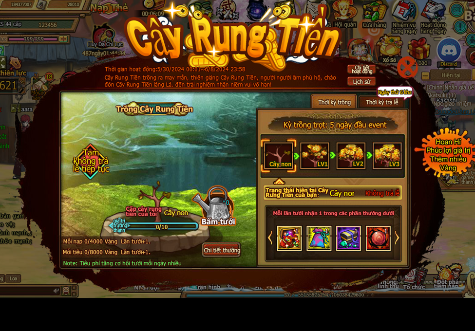 Trong thời gian hoạt động, người chơi online nhận cơ hội rút thưởng may mắn miễn phí, và có thể tiêu hao vàng và lễ kim rút thưởng. Mỗi lần rút thưởng vàng nhận 1 điểm tích lũy. Điểm Tích Lũy dùng để vật phẩm quý. Mỗi lần rút thưởng được 5 điểm may mắn. Đủ 100 điểm may mắn sẽ có 1 cơ hội quay Mật Bảo