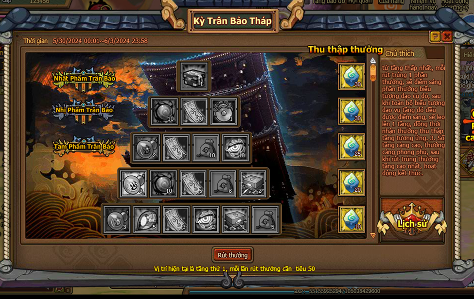 1. Từ tầng thấp nhất, mỗi rút trúng 1 phần thưởng, sẽ điểm sáng phần thưởng biểu tượng đạo cụ đó đều được điểm sáng, sẽ leo lên 1 tầng, đồng thời nhận thưởng thu thập tầng tương ứng.