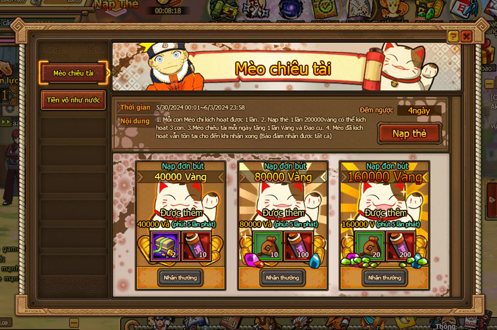 3. Mèo chiêu tài mỗi ngày tặng 1 lần Vàng và đạo cụ.