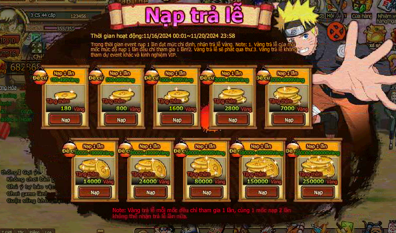 Trong thời gian event nạp 1 lần đạt mức chỉ định , nhận trả lễ vàng