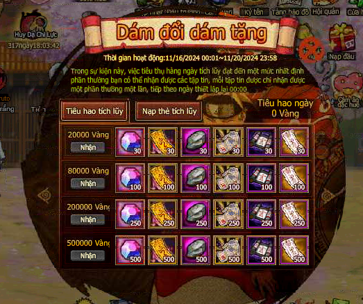 Vàng trả lễ của mỗi mốc mức độ nạp 1 lần đều chỉ tham gia 1 lần