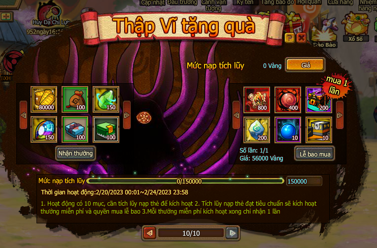1. Hoạt động có 10 mục, cần tích lũy nạp thẻ để kích hoạt.