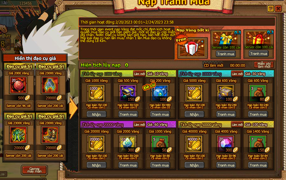1. Trong thời gian event nạp Vàng đạt mốc chỉ định kích hoạt quyền mua đạo cụ giới hạn giảm giá: một số đạo cụ còn miễn phí nhận.