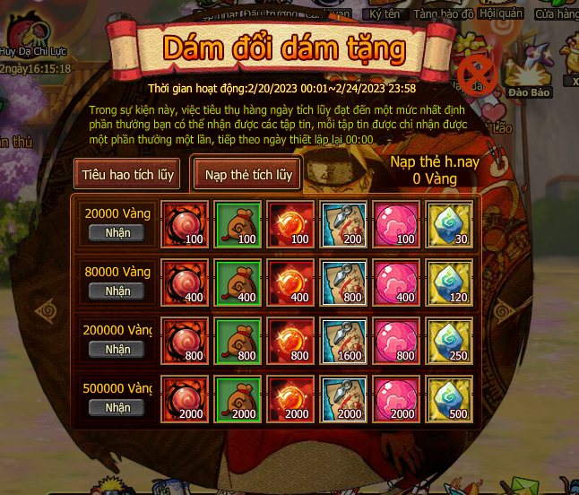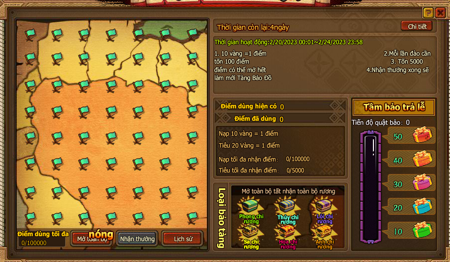 5. Trong thời gian event , nạp 1 lần đầu tiên thỏa nhận thêm bảo tàng khoáng . Trong thời gian , thống kê mức nạp của người chơi toan sv đến giải thưởng may mắn , Mổi nạp 1 Vàng giải thưởng tăng 1 Vàng , mỗi ngày 12:00, 18:00, 22:00 rút ngẫu nhiên 3 người chơi may mắn trong người chơi nạp thẻ toàn sv trả lễ Vàng