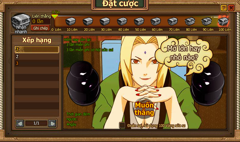 2. Thi đấu bắt đầu khi người chơi điểm số mình lớn hơn hay nhở hơn điểm của Tsunade, nhấn vào nút Lớn hoặc Nhỏ.