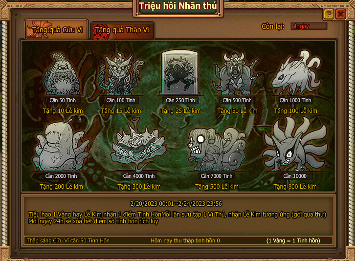 4. Tiêu hao 1 vàng/ lễ kim nhận tinh hồn , thu thập đủ điều kiện nhận rương quà qua thư