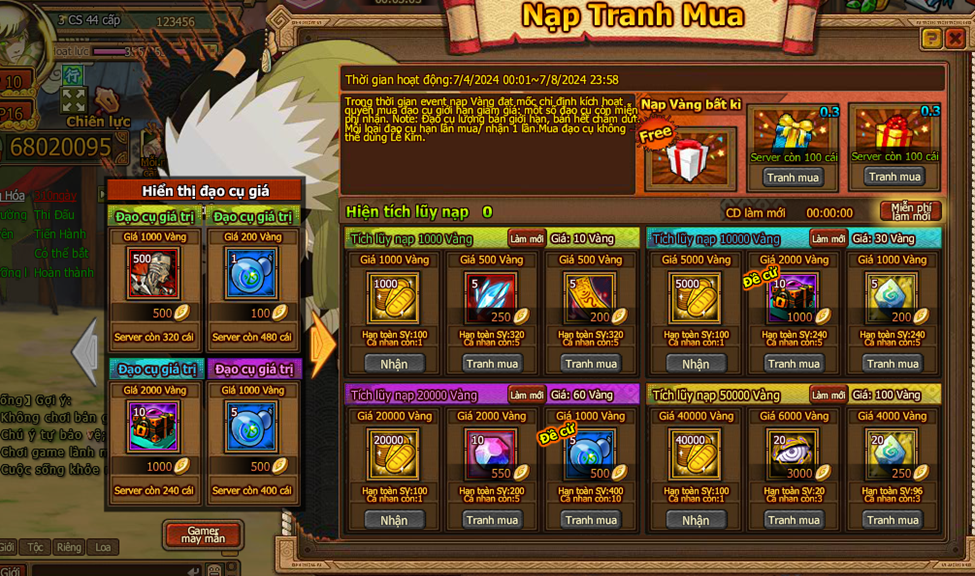 1. Trong thời gian event nạp Vàng đạt mốc chỉ định kích hoạt quyền mua đạo cụ giới hạn giảm giá: một số đạo cụ còn miễn phí nhận.