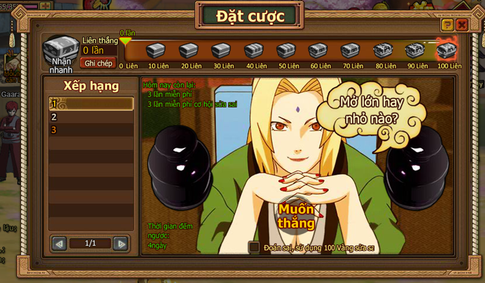 2. Thi đấu bắt đầu khi người chơi điểm số mình lớn hơn hay nhở hơn điểm của Tsunade, nhấn vào nút Lớn hoặc Nhỏ.