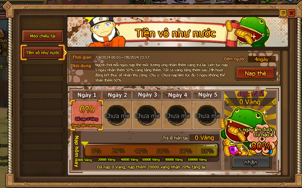 1. Người chơi mỗi ngày nạp thẻ mốc tương ứng nhận thêm vàng trả lại. Liên tục nạp 5 ngày nhận thêm 80% vàng tặng thêm. Tất cả vàng tặng thêm sau 24h hoạt động kết thúc sẽ nhận thủ công. Chú ý: Chưa nạp liên tục đủ 5 ngày không thể nhận thêm 80%.