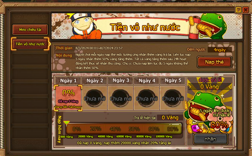 1. Người chơi mỗi ngày nạp thẻ mốc tương ứng nhận thêm vàng trả lại. Liên tục nạp 5 ngày nhận thêm 80% vàng tặng thêm. Tất cả vàng tặng thêm sau 24h hoạt động kết thúc sẽ nhận thủ công. Chú ý: Chưa nạp liên tục đủ 5 ngày không thể nhận thêm 80%.