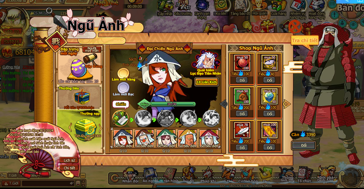 7. ở [Shop Ngũ Ảnh] tiêu [Tinh hồn] đổi các loại đạo cụ, và Ninja mới [Summer Pain] đợi bạn chiêu mộ.