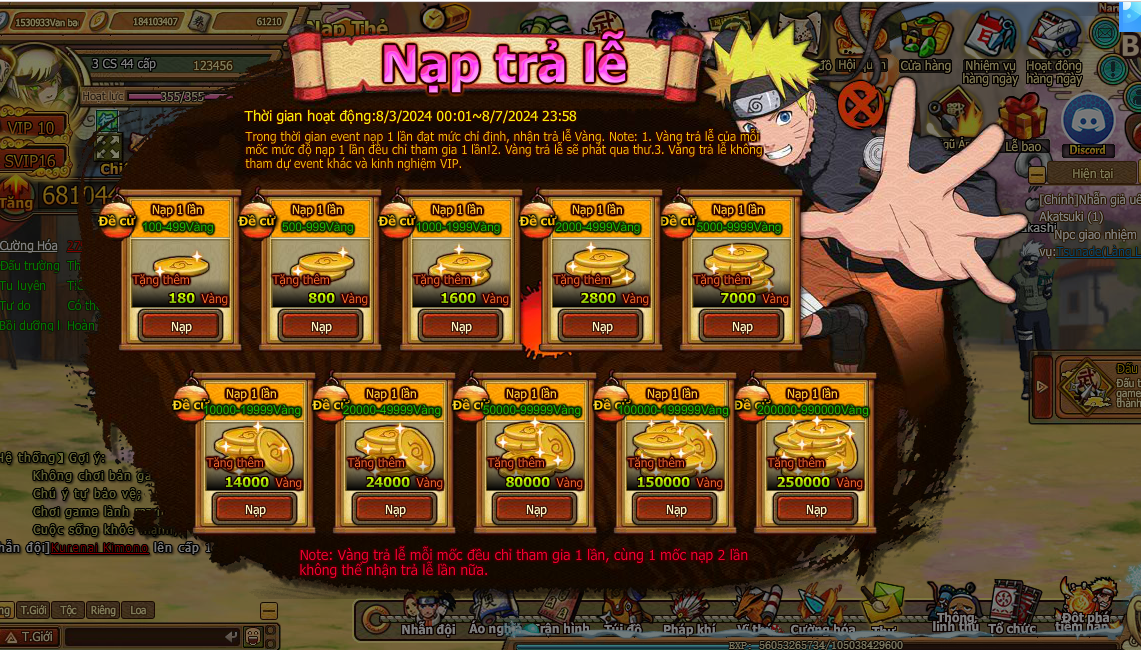 Trong thời gian event nạp 1 lần đạt mức chỉ định , nhận trả lễ vàng