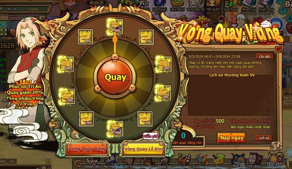1. Trong thời gian event, người chơi nạp đủ 500 vàng nhận 1 lần cơ hội quay ( vòng quay vàng )