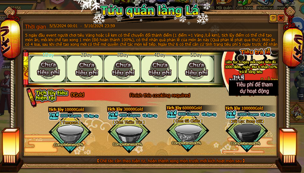 1. 5 ngày đầu event người chơi tiêu Vàng hoặc Lễ Kim có thể chuyển đổi thanh điểm ( 1 điểm = 1 vàng / lễ kim )
