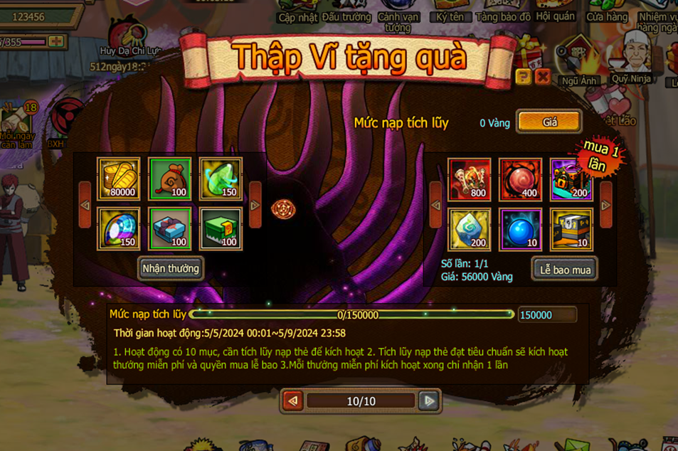 1. Hoạt động có 10 mục, cần tích lũy nạp thẻ để kích hoạt.