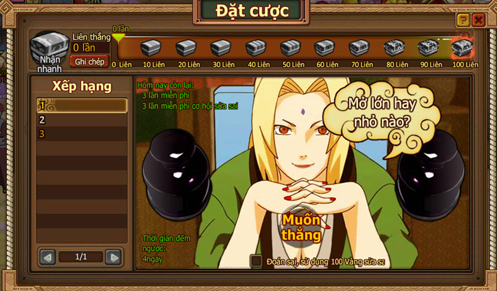 2. Thi đấu bắt đầu khi người chơi điểm số mình lớn hơn hay nhở hơn điểm của Tsunade, nhấn vào nút Lớn hoặc Nhỏ.